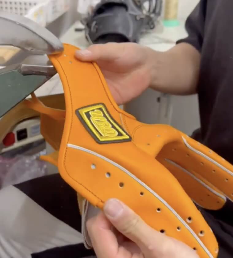 まず、厳選された革を部位ごとに丁寧に裁断し、ポジションに合わせて最適な形に仕上げます。次に、芯材や指袋を組み上げ、手に馴染むフィット感を生むため、一つひとつ手作業で縫製。指の動きや強度を左右する要となる“型付け”では、職人が革のクセを読みながら理想の形へ整えます。最後に細部の調整と検品を行い、ようやく一つのグラブが完成します。